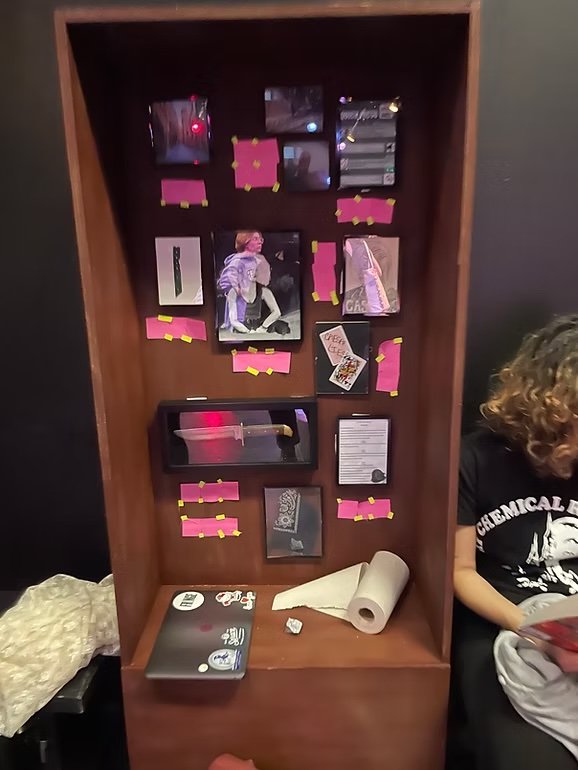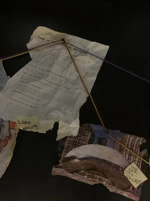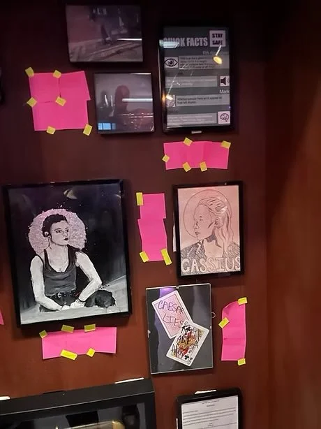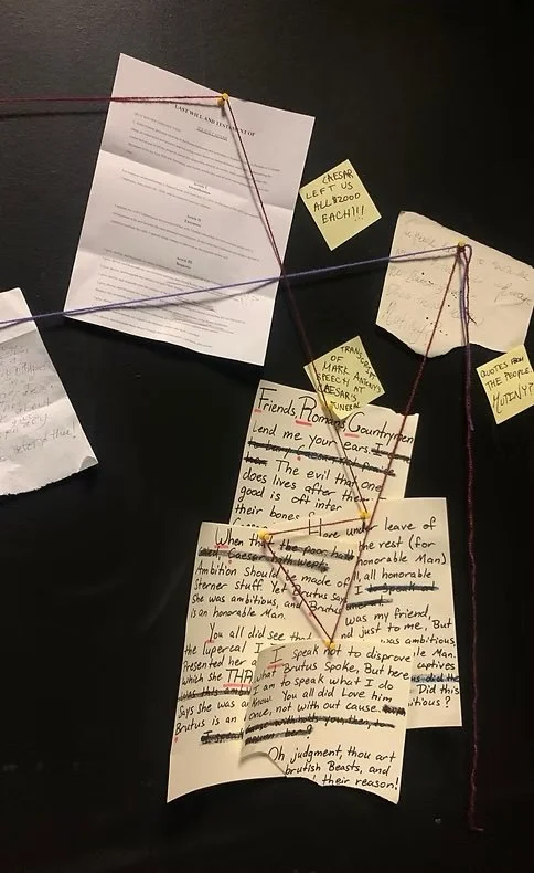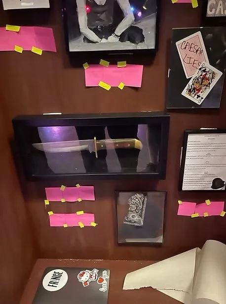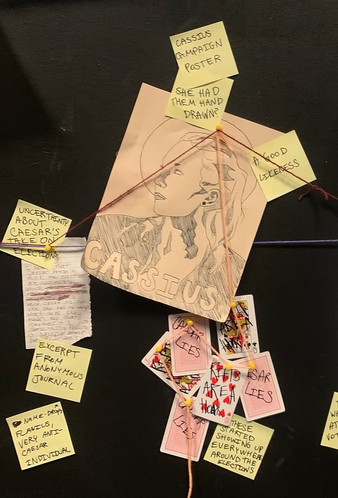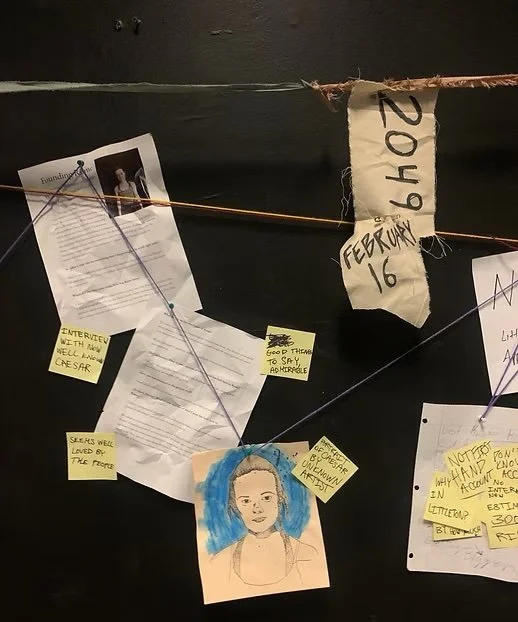 The post apocalyptic world of our Caesar was full of mysteries and I turned the back wall of our acting studio (a small black box space) into a huge timeline/conspiracy board. I worked with the director and actors to flesh out the lore of our apocalypse and within the world of the show, the wall was research being managed by one of the characters and served as a piece of information that “new citizens of the Rome Safehouse” (audience members) could read in our pre-show. It featured a timeline made of dyed fabrics, clippings from fake articles, printed out social media posts, pictures of suspicious occurences, a map, hand written notes, sticky notes with comments on the research, original art, and more. It was updated during the shows’ intermission to reflect the death of Julius Caesar and events surrounding it.