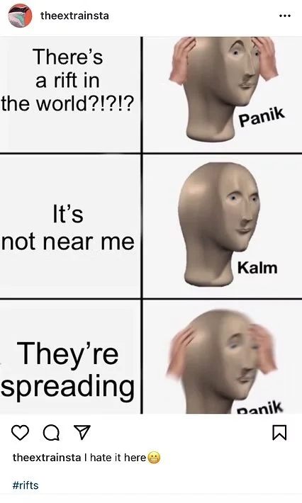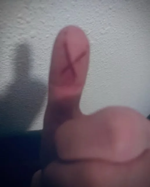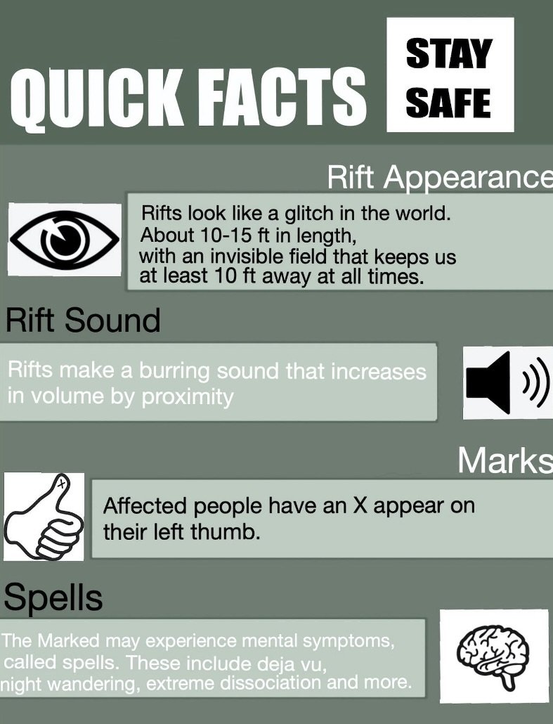 "Candid" photo of woman experiencing a spell, example of a rift affected person's Marked thumb, and Rift safety poster