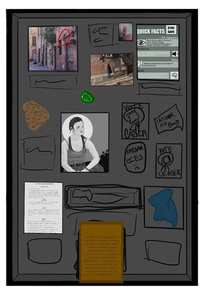 Wall close ups featuring handwritten transcript of Mark Antony's speech, Caesar's will, Pro Cassius poster (drawn based on a picture of our Cassius actor), Portrait of Caesar (drawn based on a picture of our Caesar actor), Anti Caesar Propaganda, and more.