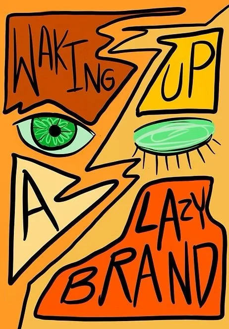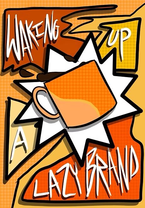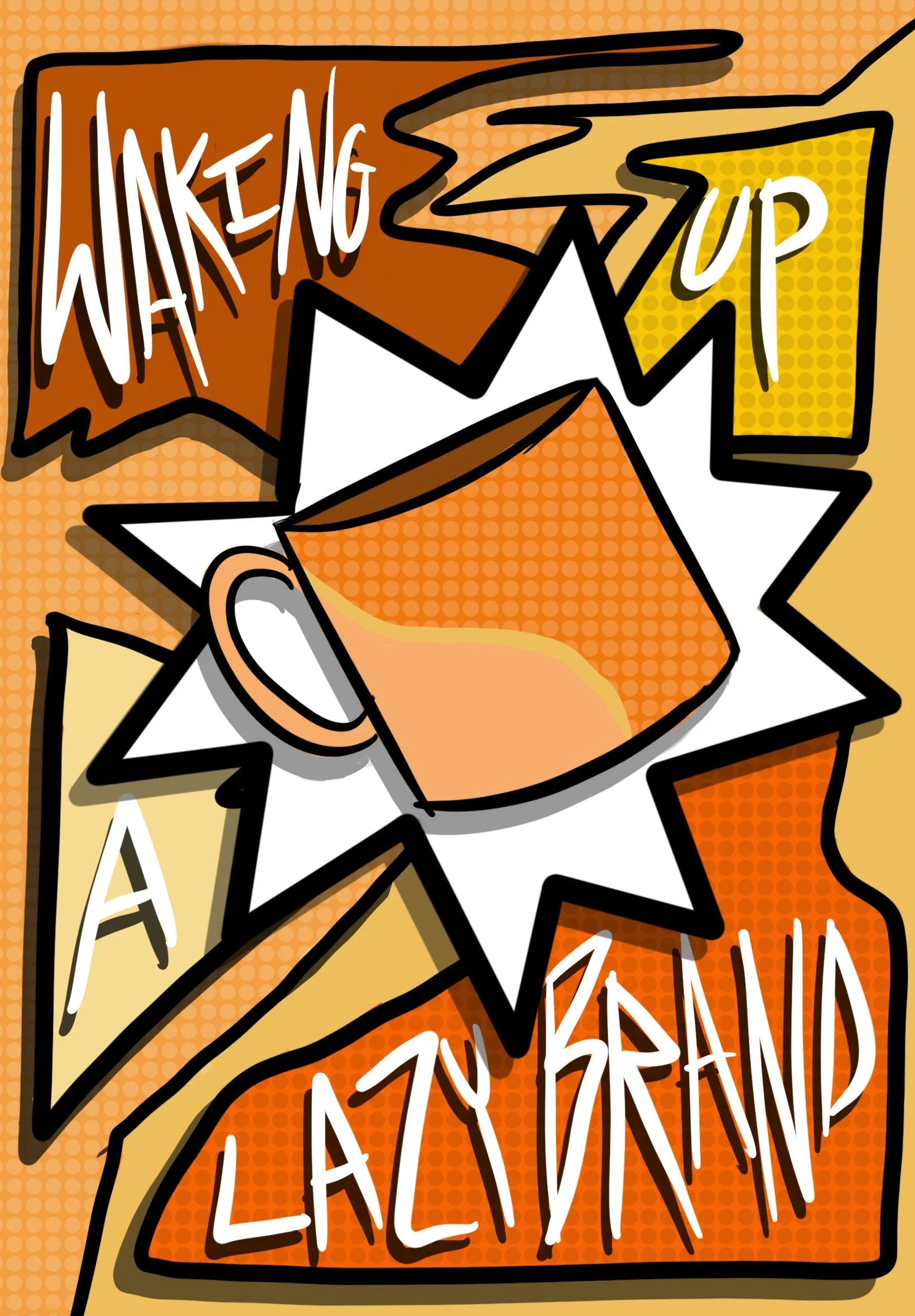 Features bright warm colors, spiky shapes, and coffee cup image meant to visually "wake up" the viewer. Art style meant to resemble a comic book with thick lines, spiky bubble, and dot patterns.